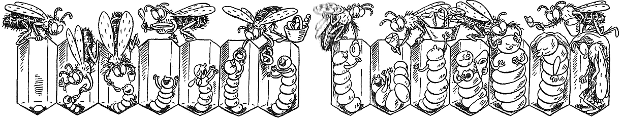 Некоторые личинки были уже такие толстые, что им нельзя было больше есть, не то они перестали бы помещаться в сотах. И тогда с ними вот как поступали: к такому толстячку подсаживалась пчела, убаюкивала обжору, потом закрывала его ячейку и залепляла воском. А когда малыш проснётся через некоторое время, это будет уже не личинка, а готовая пчела. Так, знаете ли, появляются на свет все пчёлы.