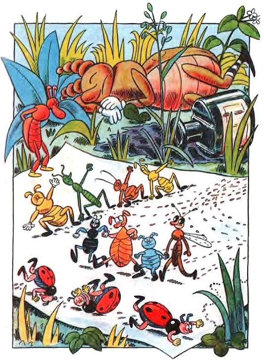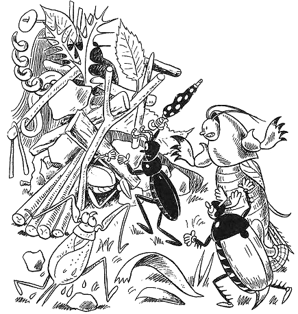 Враги перешли в наступление. Куда же спрятаться бедному Пытлику? Скорее! Он заметил какоето отверстие в Вавилонской башне и влетел туда. Преследователи за ним. Тогда он вылетел в другую щель. Но при этом задел какието подпорки, балки и щепки, и трахтарарах! вся конструкция рухнула. Всё вперемешку: камешки и кусочки коры, колонны и потолки посыпалось на Хрущака, Медведку, Майского жука и Скорпиона, да так неожиданно, что Хрущак даже не успел раскрыть свой зонтик.