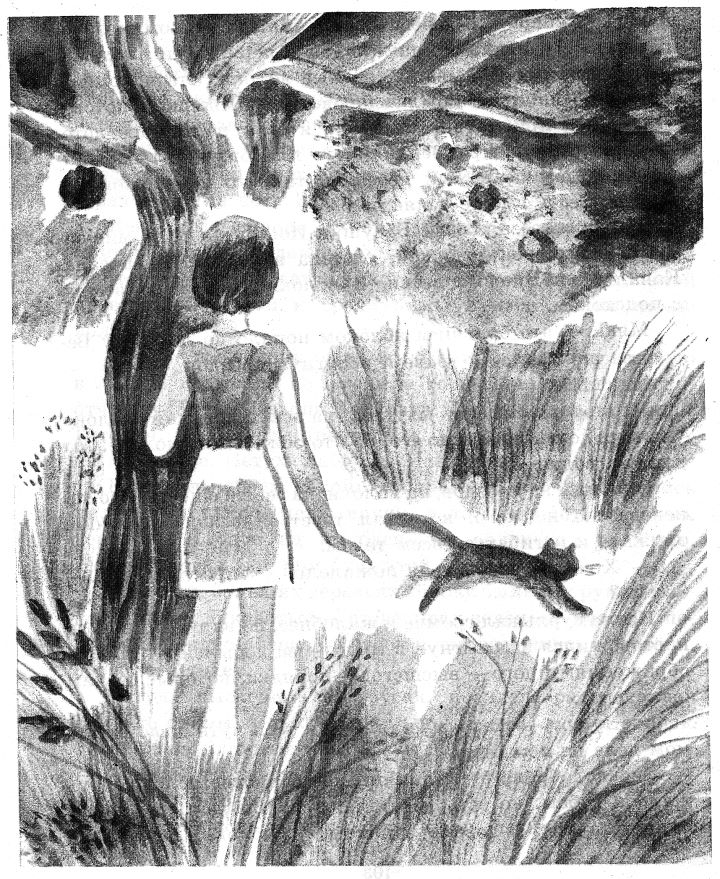 От обиды на дроздов, на яблоки, на себя и ещё на кого-то, неизвестно на кого, кот стал тереться о ноги девочки, дрожать и изгибаться всем телом.