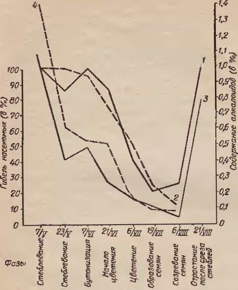 Рисунок 1 показывает изменения в токсичности для насекомых водных настоев листьев и стеблей живокости высокой в разные фазы её развития. Как видно, настои листьев и стеблей наиболее токсичны от начала отрастания до начала цветения. После цветения токсичность водных настоев листьев падает. Трава, отросшая осенью после среза усохших стеблей, была так же токсична, как листья и стебли в период весеннего отрастания. Полного параллелизма кривой токсичности и кривой алкалоидоносности нет. Это объясняется изменением состава алкалоидов в течение сезона, так как только алкалоид элатин особенно токсичен для насекомых.