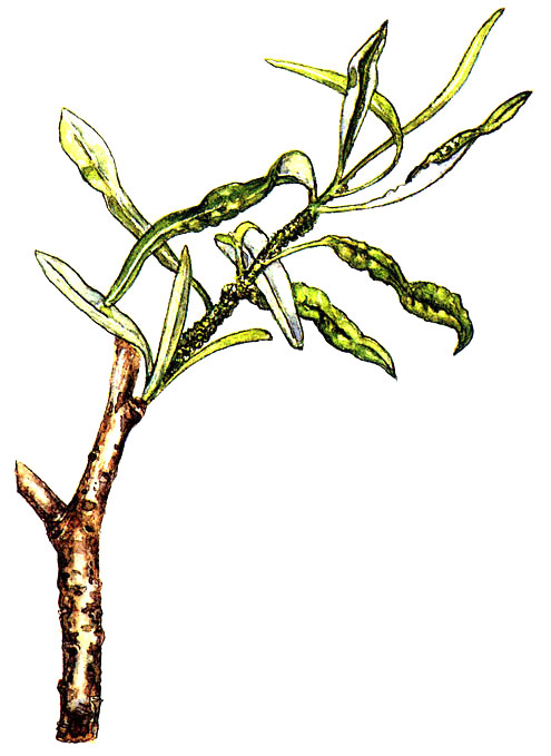 Зеленая облепиховая тляЗеленая облепиховая тля. Листья и побег, поврежденные тлей
