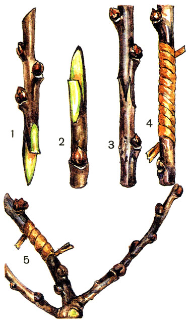Прививка способом улучшенной копулировки: 1 черенок мужского растения 2 перепрививаемая ветвь женского растения 3 совмещение прививаемых частей 4 наложение обвязки пленкой 5 перепривитая ветвь женского растения