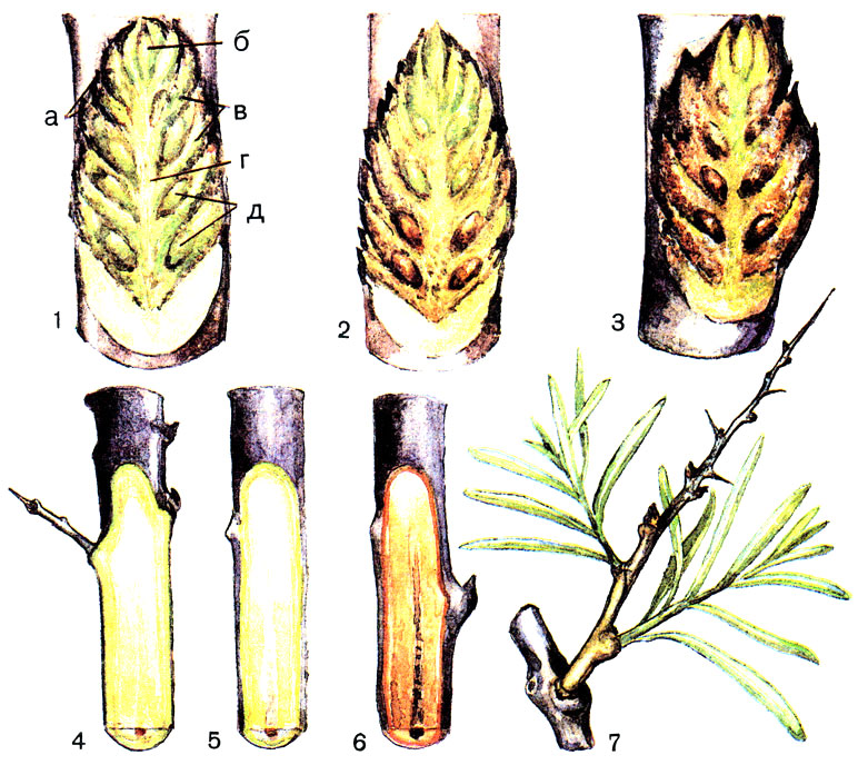 Зимне-весенние повреждения облепихи: 1 неповрежденная (генеративно-вегетативная) почка; 2 частичное подмерзание зачатков цветков в почке; 3 подмерзание всех зачатков цветков (конус нарастания не подмерз); 4 неповрежденная ветвь; 5 слабое подмерзание древесины; 6 полная гибель ветви; 7 восстановление роста на подмерзшей ветви а почечные чешуи б конус нарастания в внутренние кроющие листочки г ось соцветия д зачатки цветков