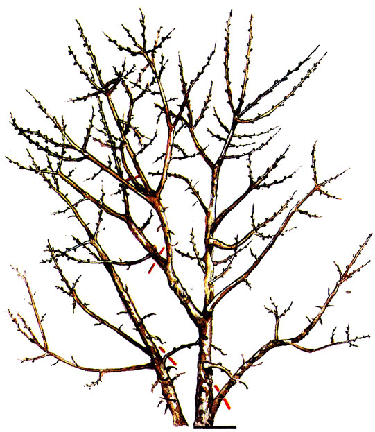 Омолаживающую обрезку применяют к старым растениям (8-10 лет и старше), когда приросты становятся маленькими (1015 см), основные скелетные ветви усыхают и урожайность резко снижается. Для этого кусты обрезают на трехлетнюю древесину.