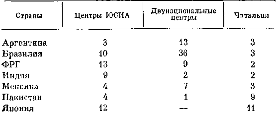 Пропагандистские центры ЮСИА учреждены к настоящему времени в 105 странах. В основном представительства ЮСИА сосредоточены в столицах и крупнейших центрах этих стран (представительства ЮСИА за границей называются ЮСИС «Юнайтед Стейтс информейшн сервис»). Всего насчитывается 298 зарубежных представительств ЮСИА5. Кроме того, под эгидой ЮСИА ведут американскую пропаганду так называемые «двунациональные информационные центры». Двунациональные центры учреждаются на «кооперативных» началах с правительством данной страны. Их насчитывается 154 в 35 странах. Главным образом они действуют в странах Латинской Америки, где их насчитывается 119. Двунациональные центры располагают такими же материальными и техническими средствами ведения пропаганды, что и основные посты ЮСИА (ЮСИС), и проводят аналогичную работу. Далее, ЮСИА содержит во многих зарубежных странах свыше 180 библиотек и около 80 читален, являющихся одновременно экспедициями по рассылке бесплатной пропагандистской литературы.
