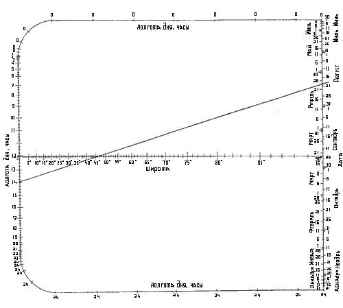Для определения северных широт необходимо: замерить долготу дня с момента появления верхушки солнечного диска над горизонтом при восходе, до момента его полного исчесзновения за горизонтом при заходе; найти на левой шкале цифру полученной долготы дня и соединить ее с соответствующей датой на правой шкале с помощью линейки или натянутой нити. В точке пересечения линейки или нити с горизонтальной шкалой широт находится искомая широта. При определении номограмма должна лежать на совершенно ровной поверхности.
