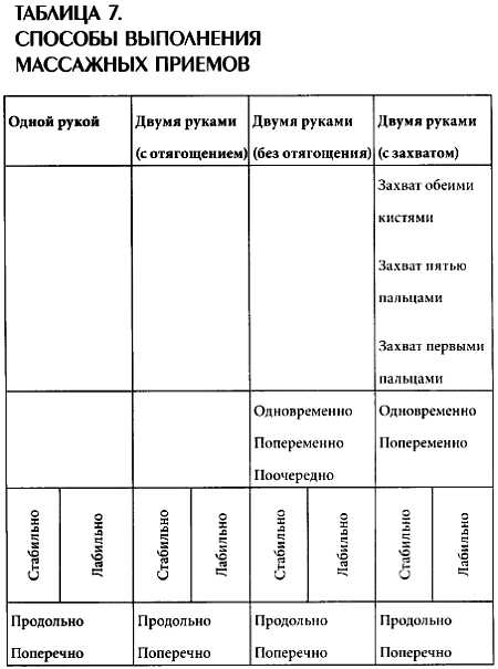 В каждой из 4 групп массажных приемов выделяют как базовые движения, так и их вариации (дополнительные движения), которые в свою очередь подразделяются на 2 формы стабильную и лабильную. Все базовые движения выполняются одной рукой, вариации вспомогательных, и в особенности комбинированных приемов как одной, так и двумя руками (табл. 7).