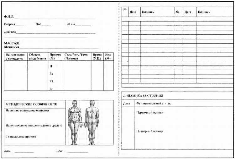 Таким образом, при оформлении назначения любого массажного воздействия следует детально описывать методику воздействия с использованием вышеперечисленных характеристик, тем самым строго регламентируя дозирование как отдельного приема, так и процедуры и всего курса в целом в ожидании конкретного предполагаемого эффекта. Наглядно пример возможности дозирования массажного воздействия при оформлении процедурной карты приведен на рис. 37.