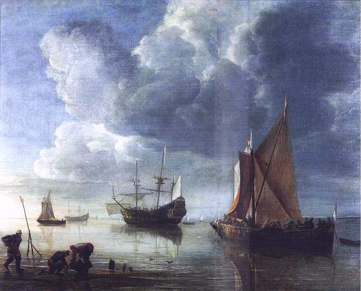Мастер предпочитал создавать полотна, пронизанные спокойствием. Представленная картина с ясным небом и морским штилем типична для творчества Дуббельса. Он часто рисовал парусные корабли на фоне берега, его полотна отличаются лишь количеством судов. В композиции этого произведения три части: небо с облаками, лодки на море и первый план с работающими на берегу людьми. Колористически полотно делится на два цвета: синие оттенки неба и облаков и коричнево-охристые суши и воды. Море и небо сходятся за горизонтом, создавая масштабную панораму эпический фон героям на переднем плане.