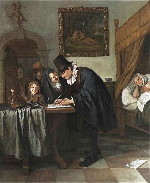 Данная, как и следует из названия, иллюстрирует сюжет посещения врачом больной девушки. Интересно, как мастер обыгрывает основной смысл произведения помещает надпись «Медицина не поможет, если болеешь любовью» на бумагу, которая валяется на полу. Несмотря на то что страдающему от любовной тоски или лихорадки не помогут врачи, шарлатан делает вид, что знает лекарство, и прописывает его. У кровати героини висит картина на соответствующую тему: влюбленная пара на свидании в лесу, у дерева. Чувственная тема была чрезвычайно популярна у публики XVII столетия.