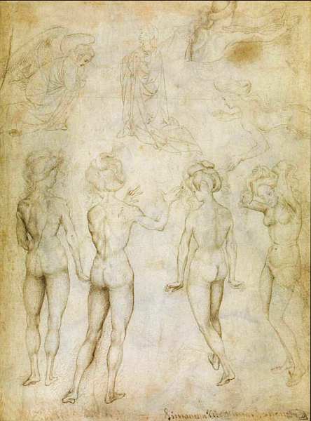 Несколько слов необходимо сказать о происхождении и характере этого, казалось бы, обычного графического листа. Он часть альбома мастерской Джентиле да Фабриано, знаменитого итальянского художника эпохи поздней готики. Пизанелло являлся его другом и младшим современником. Именно ему да Фабриано оставил свои рабочие инструменты и незавершенные произведения. Такой альбом был частью принадлежностей средневековой мастерской, общим для всех художников, творивших анонимно и коллективно. Позже альбомы постепенно становятся индивидуальными, у каждого живописца появляется свой для рисунков и упражнений. Наброски дают зрителю возможность познакомиться с этапами работы автора. Увлеченный, страстный рисовальщик, Пизанелло стремился зафиксировать все видимые явления, детали, особенности восприятия динамики, характер поверхности. На переднем плане изображены четыре обнаженные женщины. Мастер стремится уловить пульсацию мышц под кожей, напряжение спины и ног. Обращает на себя внимание и очень свободное движение плавающих фигур в верхнем правом углу.