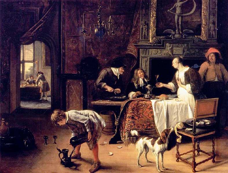 Представленная картина имеет сложную композицию, богата аллюзиями и образами. Смеющийся длинноволосый человек за столом сам Стен. Он наслаждается устрицами, молодая женщина подносит ему бокал вина. Справа стул с классической для национальной живописи композицией экзотическим лимоном и ракушками. В дверном проеме видны мужчины, играющие в нарды. Мальчик-слуга на переднем плане украдкой наливает хозяйское вино, ему сегодня повезло. Персидский ковер на столе, обилие устриц, богато декорированный камин все говорит о состоятельности владельцев и роскоши жилища.