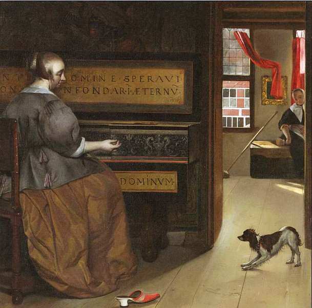 Представленное полотно прекрасный пример того, что эти надписи размещались не только на холстах как подписи, но и на изображенных предметах. Женщина играет на клавесине, она обернулась, чтобы посмотреть на собаку. Хозяйка дома представлена в традиционной одежде того времени, материя, из которой она сшита, выглядит дорого. В задней комнате девушка-служанка присела, чтобы отдохнуть. Обратите внимание, как наклон ее головы рифмуется с позой владелицы жилища. Служит этой перекличке и диагональ прислоненной к стене щетки. В колорите картины также можно выделить сочетающиеся цвета и контрастные акценты. Коричневые, черные и охристые тона дополняются ярким оттенком насыщенного красного.
