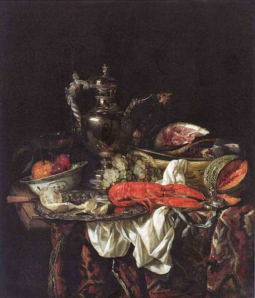 Данная работа свидетельствует о лучших качествах натюрморта золотого века голландской живописи. Исключительно эффектно обыгрывается фактура вещей: отражающая поверхность серебряного сосуда, матовая нежность винограда, насыщенно красный панцирь лангустов, осязаемые складки ткани и мягкость шерсти роскошного персидского ковра. Типичным для полотен данного жанра было выделение «главного героя» изображения. Здесь это кувшин, в котором отражается сам художник в черной шляпе у мольберта.