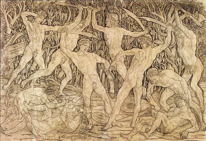 Эта довольно большая гравюра первое произведение, которое содержит полную подпись художника. Тип фигур сразу узнается, они характерны для творчества мастера. В чем назначение данного сюжета, чем он был ему интересен? Во-первых, сражающиеся обнаженные мужчины олицетворяли античную тему. По композиции сцена похожа на традиционный скульптурный фриз с изображениями битвы путти. Во-вторых, такой сюжет давал художнику возможность изображать обнаженные тела в многообразных сложных ракурсах с соблюдением анатомической достоверности. Внимание к рисунку мускулов, их внутреннему напряжению и одновременно физической легкости движений крайне типично для произведений творцов Возрождения. Поллайоло даже проводил вскрытия трупов, чтобы детально изучить строение мышц. Битвы в бане, грандиозные по невероятному количеству разнообразных сплетений обнаженных мужских тел, в следующие столетия получили большую популярность, такие рисунки можно встретить у многих живописцев европейских Академий художеств до XVIII века.