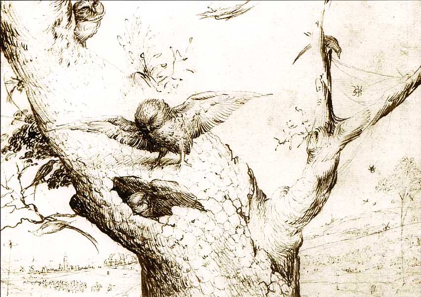 Данная работа в числе трех рисунков, подписанных лично Босхом. Это не штудия, а самостоятельное, полноценное произведение искусства. Его композиция очень необычна для того времени. Босх очень близко изображает ствол дерева и нескольких птиц у своих гнезд на нем. В центре сова сидит над дуплом, где ее ждет птенец. Слева певчая птица, скорее всего, дрозд. Справа трогающая своей непосредственностью и реалистичностью зарисовка пауков. На заднем плане вид на местность и силуэт города. Сова традиционно означала грех в арсенале христианской символики, однако здесь ее образ необязательно должен означать пороки. Она центральный персонаж листа. Сова заботится о своем питомце, выше на ветке сидит еще одна с очень интересным, очеловеченным выражением глаз. Названные и другие детали говорят о том, что перед зрителем натурная зарисовка. Данная версия приходит на ум при сравнении с рисунком «Лес, который слышит, и поле, которое видит» (б/д, Государственная галерея, Берлин), где Босх использует образ этой птицы. В нем помимо лесных обитателей повсюду нарисованы глаза и уши как прямое выражение заглавной метафоры.