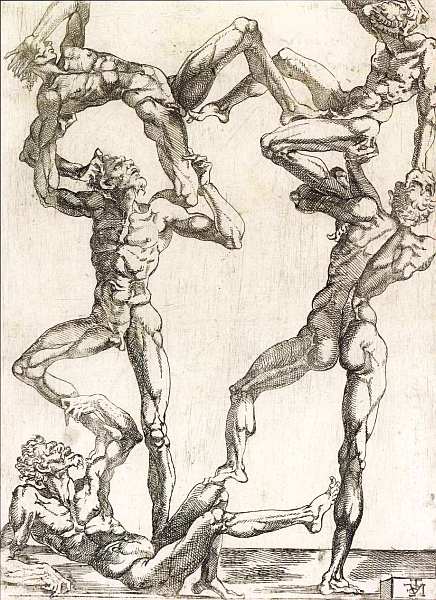 Около 1543 Жюст де Жюст создал серию из пяти гравюр с обнаженными мужчинами, которые демонстрируют чудеса акробатики. (Некоторые специалисты считают, что одним из источников вдохновения Анри Матисса для картины «Танец» (1910, Государственный Эрмитаж, Санкт-Петербург) стала именно она.) Герои, кажется, не прикладывают никаких усилий для проделывания сложных трюков, они выполняют совершенно невозможные в действительности упражнения. Манера изображения фигур примечательна: тела одновременно расслаблены, а все мышцы максимально напряжены. Данное очень необычное фантазийное произведение, без сомнения, шедевр школы живописи Фонтебло. Так называется целая группа художников, которые работали над оформлением дворца Франсуа I в 1530-х. Де Жюст был приглашен как скульптор. Именно эта профессия может объяснить интерес мастера к разнообразию ракурсов, которые можно увидеть в представленной человеческой пирамиде.