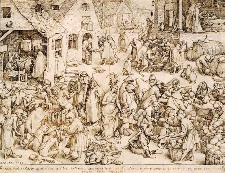 Фигура Любви стоит в центре картины, держа сердце в руке. На ее голове сидит пеликан птица, по преданию, выкармливавшая птенцов собственной кровью. Вокруг изображены семь дел Милосердия накормить голодных, напоить жаждущих, предоставлять приют странникам, одевать нагих, посещать больных, утешать заключенных в неволю и хоронить умерших. Традиция деяний была закреплена еще в готическом искусстве. Работа типична для творчества Брейгеля Старшего: многообразие поз, сложное сплетение сюжетов, остроумные аллегории, намеки, горькая сатира. Несмотря на обилие живого движения, композиция строится достаточно жестко. На первом плане лентой фриза вокруг фигуры Любви идет повествование. Второй план представляет собой перспективные декорации, где в домах и около порога группируются люди. «Театральный» компонент виден в том, что художник убирает целую стену в доме слева, чтобы зритель мог увидеть происходящее в нем.