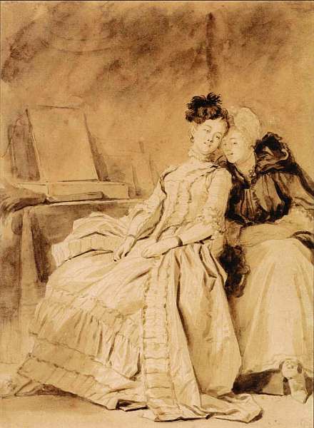 моделировки, виртуозно выстроенный объем, плотность и массивность складок. Художник эффектно расположил двух женщин с правой стороны листа. Основное в их позах доверительное движение друг к другу. Они делятся новостями или сплетнями. Об этом говорят искорка в глазах, хитрые и игривые взгляды. Прическа героини слева рифмуется с накидкой ее подруги. Диагональ, которая образуется пышной юбкой дамы слева и подставкой для рисования, уравновешивает композицию. Произведение кажется очень простым, ясным по настроению. Скорее всего, мастеру позировала жена Мари-Анна Жерар с младшей сестрой Маргаритой, его ученицей.