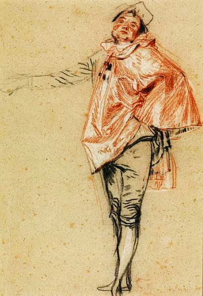 Танцор изображен в четвертой позиции, с которой начинался менуэт популярный танец эпохи барокко. Вдохновение для создания «галантных» персонажей Ватто черпал из богатой традиции итальянской комедии дель арте.