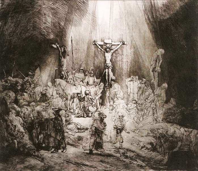 Данная работа определенно одна из самых выразительных и запоминающихся в графическом собрании музея и новаторская для своего времени. Рисунок не выгравирован, а процарапан иглой на медной пластине. Этот прием усложняет фактуру произведения, добавляет напряжения поверхности. Линии достаточно жесткие, острые, очень выразительные. Фигуры персонажей легендарного события мелькают в темноте, пространство на земле полностью занято людьми, все движется, как живая масса. Больше всего света падает на распятие со Спасителем. Такой традиционный способ символического выделения означает благодать Бога. Мастеру не важны мелкие подробности и детали, главное для него сильное и торжественное впечатление от события в целом.