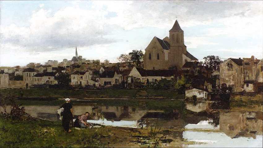 Здесь изображен маленький город Монтиньи-сюр-Луан, недалеко от Фонтебло. Работа, которая выглядела как эскиз, была новшеством в то время. Именно импрессионисты возвели набросок в ранг полноценного произведения искусства. Мастер крепко строит пространство полотна, делает очень целостную панораму. Облака серебристостального оттенка визитная карточка в арсенале его творческих приемов. Сочетания теплых тонов бежевого и зеленого напоминают палитру влиятельного французского живописца Камиля Коро. Излюбленными сюжетами Мариса стали реки, пейзажи с мельницами и тропами, морские берега с рыбацкими лодками. Привлекают внимание цельные, крупные, ясные объемы домов, четкие горизонтальные линии картины. Художник рисовал широкой кистью, очень свободно и мягко, стиль напоминал манеру великого предшественника Якоба ван Рейсдала. Музей Бойманса-ван Бёнингена хранит одну из самых талантливых работ Мариса.