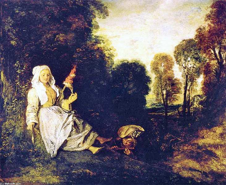 Данная картина очень типична для творчества Ватто, узнаваема. Героиня сидит с веретеном, у ее ног пастух с флейтой. Этот сюжет несет в себе ярко выраженные эротические аллюзии: пастух-вакх пытается заглянуть под юбку молоденькой девушки, которая написана довольно безучастной, похожей на симпатичную куклу. Флейта, помимо античных отсылок, сексуальный символ, так же как веретено, которое стремится отозваться на ее нежные звуки, нити и музыка должны слиться в единое целое. Сюжет неприхотлив и достаточно фриволен для первой четверти XVIII столетия. Однако современного зрителя захватывает, скорее, манера исполнения она очень нежная, мастер виртуозно создает россыпь теплых оттенков земли и зелени.