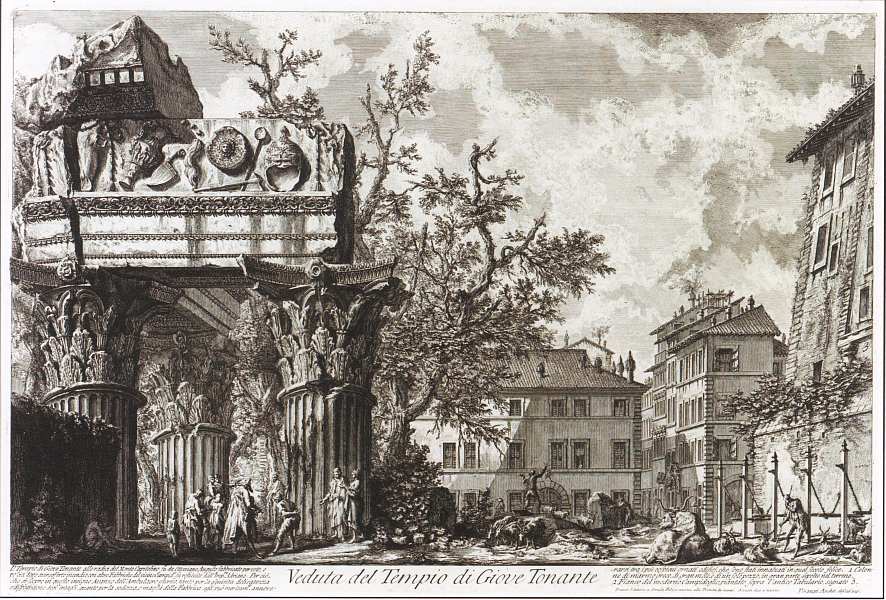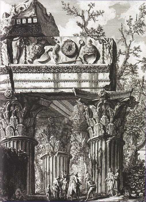 В своих гравюрах Пиранези изображал впечатляющие фантазии на тему ограниченных пространств, руин, арок, зданий, портиков. Пиранези мастер ритма, он так выстраивает ракурсы и перспективу, что зрителя цепляет какая-то загадка. Фигурки людей помещены лишь для понимания масштаба, они статисты. Один из самых тонких ценителей искусства Италии Павел Муратов писал: «Легионы разбитых статуй, тучи обелисков, ваз, урн, саркофагов, алтарей, барельефов, герм, капителей и масок Увитые плющом деревья раскидывают среди них свои ветви. Маленькие человеческие фигурки на античной мостовой кажутся рядом с ними пигмеями. Перед этими горами мраморных изваяний и архитектурных форм чувствуешь себя раздавленным. Надо было быть Пиранези, чтобы не почувствовать этого!» Римские руины подлинные свидетели величия древней культуры, и гравюры мастера постоянно напоминают об этом зрителю.