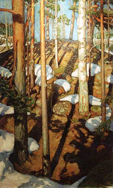 «Весна в Каллеле» изображает фрагмент финского леса. Автор выписывает стволы сосен, показывая небо лишь в просветах между деревьями. Такой прием ограничения говорит о том, что этот фрагмент, по мнению автора, является самоценным для художественного показа, каждое дерево, каждый кусок родной земли способен быть символом родины. Сильные световые контрасты, изображения солнечного весеннего дня служат метафорой надежды. Этот пейзаж может служить отличным примером искусства символизма.