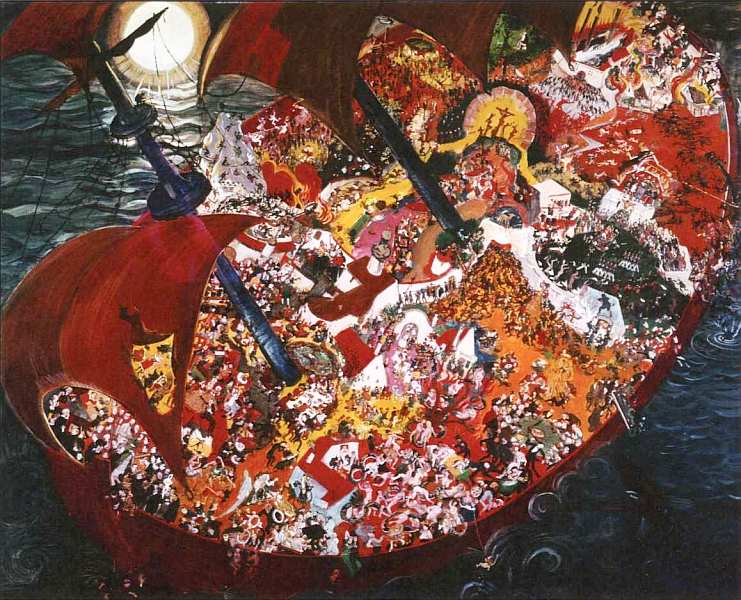 «Корабль дураков» работа, обличающая пороки, горькая критика человеческих грехов. Это аллегорическая картина со сложным, многомерным и разветвленным сюжетом. Тема ее не нова в искусстве: известно одноименное произведение (14951500, Лувр, Париж) великого нидерландца Иеронима Босха. Полотно можно рассматривать очень долго и находить все новые и новые метафоры и поучительные сюжеты. Например, сцена Распятия призвана показать, что Христос зря отдал свою жизнь за грехи человечества. Справа, почти в середине, изображена большая очередь на биржу труда, свидетельствующая об экономическом кризисе, в котором находились немецкоговорящие страны в конце 1910 начале 1920-х. Оскар Ласке, вслед за своими средневековыми предшественниками, обличает грехи сладострастия, прелюбодеяния, лжесвидетельства, алчности. Художник вводит изображения представителей богемы, праздной публики, а рядом сцены прелюбодеяния, средневековые образы смерти в виде скелета с косой, дьявола во фраке, чревоугодников в виде пузатых чудовищ и многое другое.
