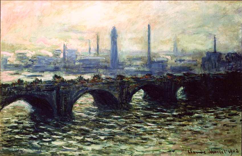 зрителем предстает дымчатый пейзаж с известным арочным мостом Ватерлоо, проплывающими под ним баржами и дымящимися трубами промышленного района на заднем плане.