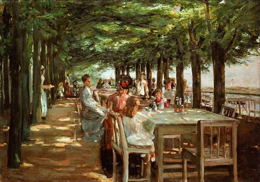 Обыденная сцена, тяготеющая к жанровой интерпретации, кистью художника наполнена поэзией. Он изображает людей, которые развлекаются и наслаждаются городской жизнью, пребывая в излюбленном месте встреч и прогулок представителей буржуазного общества. За столиком на первом плане молодая женщина с двумя девочками. Живописец будто зафиксировал свое мгновенное впечатление от пестрой подвижной массы людей. На расстоянии трудно рассмотреть каждый предмет и лица персонажей в деталях, поэтому Либерман дает их лишь в самых общих чертах, словно глядя издали. Он отказался от тщательного выписывания формы, сосредоточив внимание на ее передаче в трепетных бликах и солнечных рефлексах.