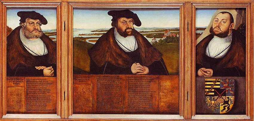 Фридрих Мудрый, а также его ближайшие родственники Иоганн Твердый и Иоганн Фридрих Великодушный были главными заказчиками Кранаха, так как он был придворным художником, на портреты этих правителей в силу их многочисленности распространялась шаблонность, пример данный портрет трех курфюрстов. Живые лица соотносятся со слегка уплощенными, условными аксессуарами. Одежда, драгоценности изображены тщательно, человек окружен в этих работах предметами-знаками, символами богатства и власти. В правом нижнем углу дан щит со скрещенными мечами герб Фридриха III. Рисунок максимально упрощен до основных линий, достаточных для того, чтобы портретируемые были узнаваемы.
