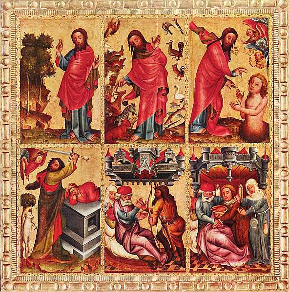 В другой композиции Бог создает животных и птиц, которых художник старательно пишет, отмечая их характерные особенности и проявляя большой интерес ко всему живому. Пейзажи на заднем плане отсутствуют, а золотой фон, заполняющий каждое клеймо, лишает работу перспективы. Цвет алтарных клейм локальный, но он помогает передать форму, объем и особенности предметов.