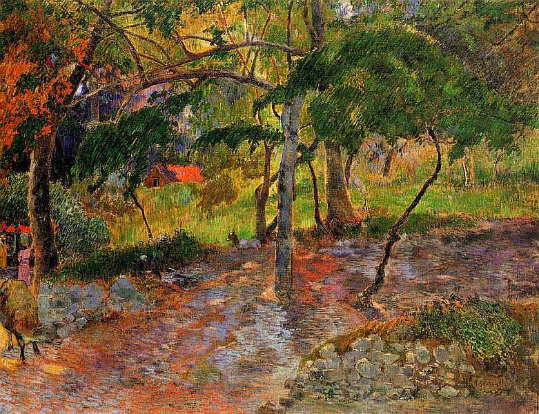 В 1887 Гоген отправился в свое первое путешествие на экзотический остров Мартиника. Именно там он понял, что для творческой работы ему требуются уединение, бегство от тягот и суеты европейской жизни. Стилистически пейзаж выполнен в авторской манере, развитой еще в Бретани: небольшие, жестковатые мазки, образующие плотную фактуру изображения, и преимущественно темная, чуть выцветшая красочная палитра. Довольно быстро художник столкнулся с тем, что приемы импрессионизма не подходят для сочного великолепия щедрой тропической природы. Болезнь и отсутствие работы не позволили Гогену долго оставаться на острове, после серьезной болезни мастеру пришлось покинуть тропический рай.