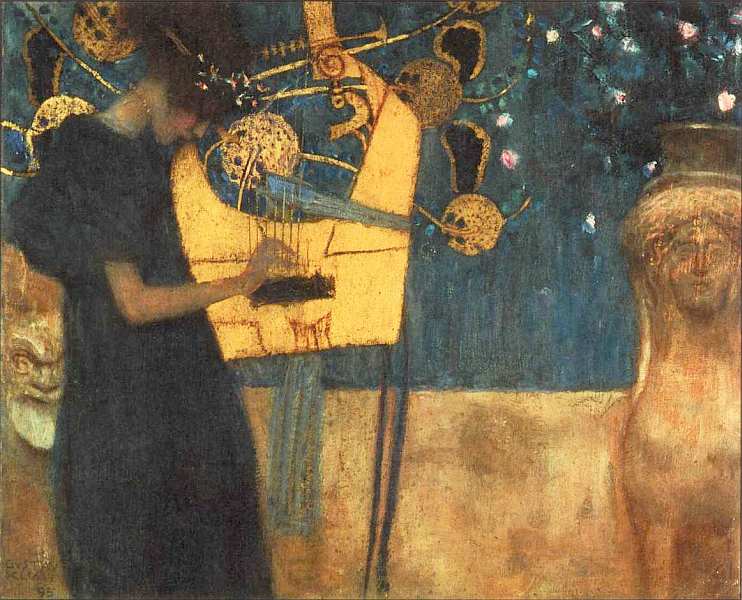 В представленной картине четыре важных композиционных и смысловых фрагмента. Фигура молодой девушки в простом черном платье явно отсылает к образу музы, аллегории музыки. Она держит золотую кифару древнегреческий инструмент, традиционный символ Аполлона и Терпсихоры. Следующим важным акцентом является охристый цвет глиняных идолов сосудов для вина в виде древнегреческих богов Пана и Сфинкса. Пан считался богом плодородия и дикой природы, возможно, художник также обыгрывает образ Вакха, Диониса, помня о дионисийской культуре Фридриха Ницше. Сосуды с изображением Сфинкса хранятся во многих музеях мира, один из них стал прообразом для этого полотна. Наконец не меньшую символическую значимость несет насыщенно синий фон картины. Это цвет ночи, которая в искусстве рубежа веков обозначала тайные, мистические стороны души и жизни человека, это время суток, когда совершаются как чудеса, так и преступления, не стоит забывать и об его откровенно эротическом смысле. Символика синего цвета разнообразна. На этой поливариантивности интерпретаций традиционно держится искусство символизма, когда каждый выбирает трактовку по душе. Так, синий может быть и образом вечности, ночи, неба, божественного, мудрости, тайны, меланхолии и телесной любви. В целом картина привлекает внимание богатством декоративной трактовки и многозначностью темы.