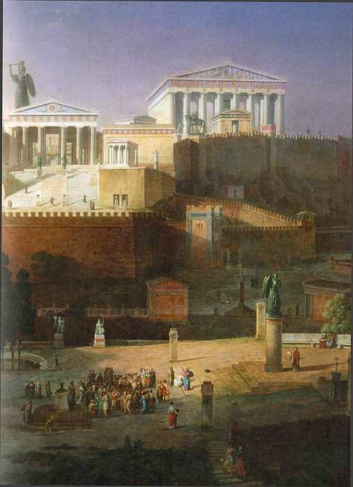 Этот холст характерный пример так называемых архитектурных живописных реконструкций. Они были нужны Кленце и как штудии искусства древних греков, которым он хотел во всем подражать, и как источник творческого вдохновения. С особой тщательностью зодчий изучал архитектурные памятники в своих путешествиях по Италии, Сицилийскому королевству и Греции. Мастер на основе своих впечатлений представил, как могли выглядеть Афины до разрушений в Средние века и Новое время. Древнегреческая архитектура служила своего рода напоминанием о государственных доблестях и высоких морально-нравственных сторонах полисов, что придавало подобным картинам еще и морализаторский смысл.
