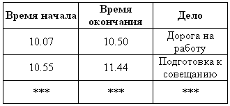 Следующее упражнение, занимающее первое место по эффективности, хронометраж. Что это такое? Вы берете бланк, на котором разлинована таблица из нескольких полей: время начала, время окончания, дело. Далее в течение дня заносите туда все, что делаете. Фиксируете время начала-окончания и кратко название дела.