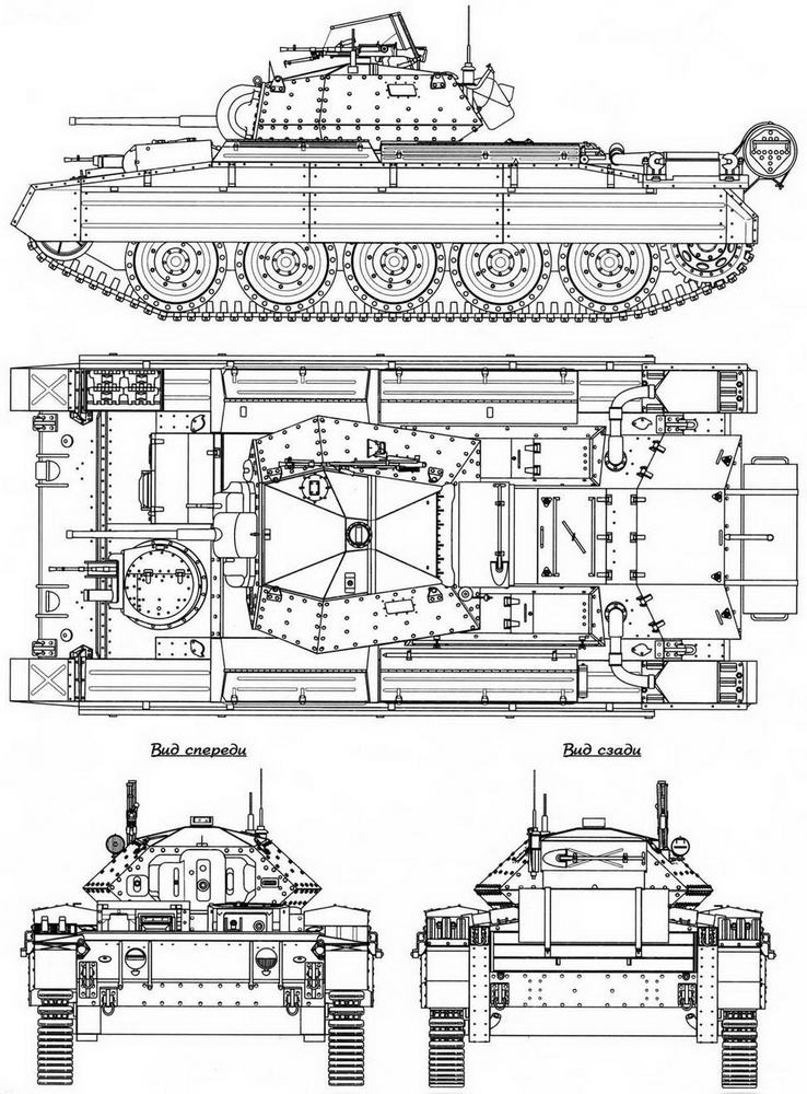 «Крусейдер III», вид сверху. Башенный люк открыт, на крыше башни хорошо различимы два прибора наблюдения Mk IV и колпак вентилятора. Судя по эмблеме на правом борту башни, это машина из Артиллерийской школы в Лалворте