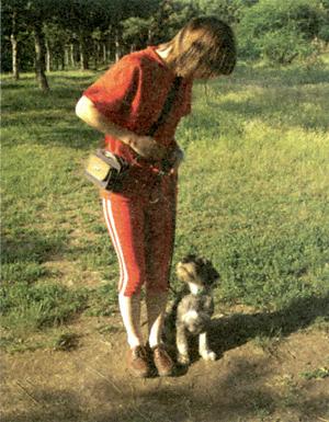 Становимся справа от собаки, держа лакомство в руке у ее носа. Пока собака увлечена обнюхиванием руки, делаем один шаг (описываемое здесь движение совершается вокруг собаки против часовой стрелки, при этом ваша рука ни на миллиметр не уходит от собачьего носа). Если собака при этом осталась сидеть кликаем и даем лакомство.