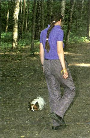 Возвращаемся на исходную позицию. Делаем по кругу 3 шага, 3 шага назад, клик, лакомство. Увеличивая постоянно количество шагов, мы подходим постепенно к такому моменту, когда шаги назад уже не надо будет делать, потому что мы совершим полный круг вокруг собаки. Сделав круг и не нарушив выдержку кликнем и дадим собаке лакомство. Не забывайте, что все это время рука с лакомством находится у носа собаки.