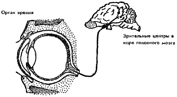 Рецепторы сетчатки передают световые сигналы моментально, а потом только дополняют сигналами об изменении или исчезновении светового раздражителя. Существуют рецепторы, которые передают только изображения предметов. Другие рецепторы реагируют только на появление или исчезновение светового сигнала или его движение. Информация от сетчатки глаза передается по волокнам зрительных нервов в мозговые центры, расположенные в затылочной части коры полушарий головного мозга. В зрительном нерве находится около одного миллиона нервных волокон, каждое из которых делится на несколько канальцев, способных передавать самостоятельно импульсы возбуждения. Из поступивших импульсов в зрительных областях коры формируются световые ощущения в виде стереотипных отображений предметов окружающей среды.