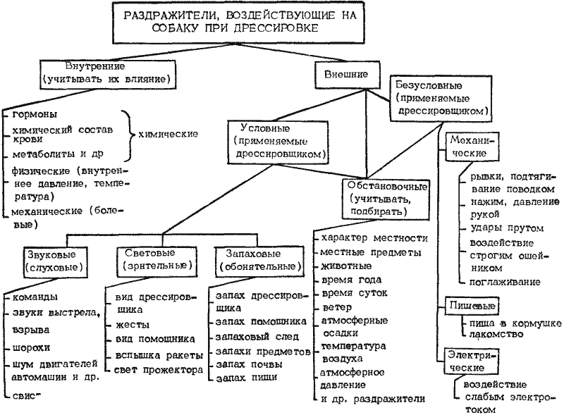 При дрессировке учитывается степень влияния на собаку всевозможных раздражителей. Все они делятся на три группы: продуманно подбираемые и применяемые дрессировщиком, неизбежно сопутствующие (обстановочные) и внутренние.