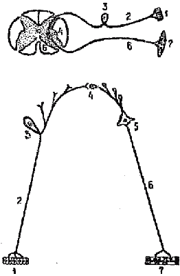 Каждый рефлекс содержит афферентные (сенсорные) и эфферентные (исполнительные) звенья, составляющие рефлекторную дугу. Афферентная часть рефлекторной дуги состоит из рецепторов и чувствительных нейронов, эфферентная из двигательных нейронов и исполнительного органа (мышца, железа, ткань). Для осуществления рефлекса необходимы, по крайней мере, два нейрона: чувствительный и двигательный. Такая нейронная цепь называется простой рефлекторной дугой. В большинстве рефлекторных дуг участвует множество вставочных промежуточных нейронов, и такие дуги называются многонейронными (рис. 5).