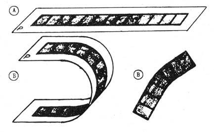 На двухмерной плоскости Р размещается плоское тело (рис. 8, А). Если эту плоскость искривить в третьем измерении (рис. 8, Б), то все расстояние между любыми двумя точками этого тела сохраняются. При попытке же искривить двухмерную фигуру в пределах двухмерной системы неизбежно произойдет деформация фигуры, ее метрические характеристики изменятся (рис. 8, В).