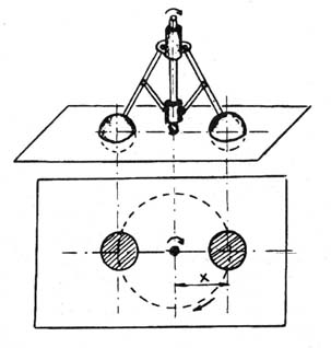 Предположим, что в качестве такого тела будет использован центробежный регулятор, причем в плоскость сечения попадут его ось и грузы (рис. 6). Плоскатики, обитающие в этой двухмерной системе, исследуя эти объекты, не смогут обнаружить видимой связи между этими тремя независимо существующими телами. Они смогут констатировать факт, что скорость вращения грузов и расстояние от оси до центров грузов (х) зависят от скорости вращения. Но почему? Этого плоскатики объяснить не могут, так как механизм системы не известен им. По всей вероятности, для описания этого явления им пришлось бы ввести некоторые условные понятия, аналогичные нашим понятиям "поле" или "взаимодействие", которые отражали бы реальную действительность, но не объясняли бы природы явлений.