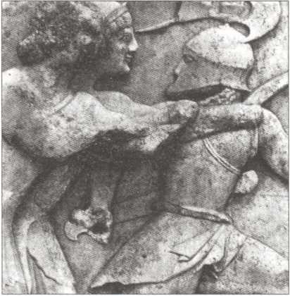 Аполлон, Артемида и гигант. Деталь северного фриза сокровищницы сифнийцев в Дельфах.