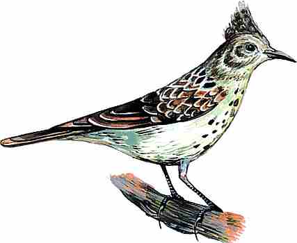 Хохлатого жаворонка от его собратьев отличает небольшой хохолок на голове и более плотное сложение. Длина этой птички около 18 см. Хохлатый жаворонок не любит залетать севернее средней полосы, а основное место его обитания Средняя Азия и казахские степи. Питается жаворонок зернами, семенами, травами. Гнездится он повсюду в полях, в степях, в садах. Самочка откладывает от 4 до 6 яичек.
