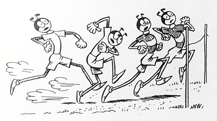 «Бах!» прозвучал выстрел из стартового пистолета, и все бросились бежать. Ах, до чего же это был красивый старт! Никто не задержался, никто не схитрил не выбежал раньше других. Все летели стрелой до отметки в пятьдесят муравьиных метров. А теперь посмотрите-ка, что там? Синие почти в полном составе рвутся вперёд, публика в полнейшем восторге, и вот уже двое из команды синих рвут финишную ленточку. За ними третьими и четвёртыми прибежали жёлтые.