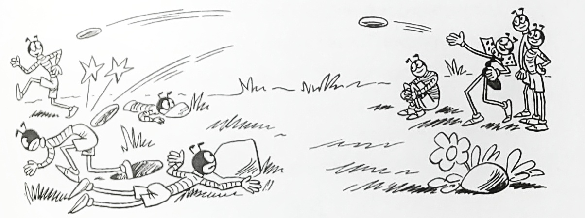 как следует правильно поворачиваться, держать и выбрасывать диск. И тут Ферда заметил неподалёку несколько чёрных камней. Но это были не камни, а головы муравьёв из муравейника спортсменов, которые подглядывали за командой Ферды.
